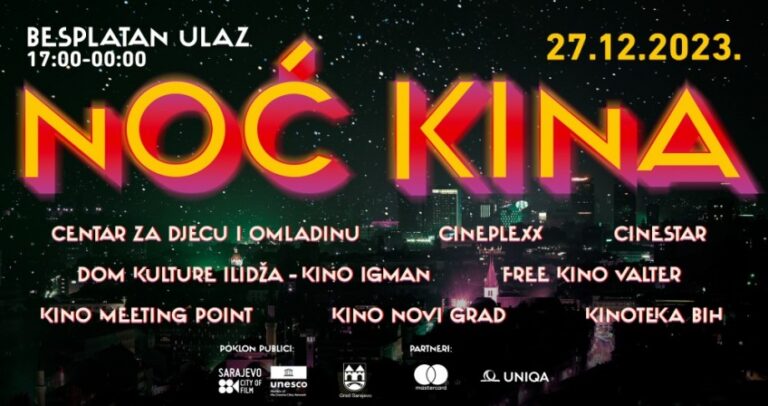 Noć kina bit će održana sutra, u srijedu, 27. decembra od 17 sati do ponoći. Besplatan ulaz u kina građanima i turistima Sarajeva omogućili su Sarajevo grad filma UNESCO-a i Grad Sarajevo. Partneri projekta su Mastercard i UNIQA osiguranje.